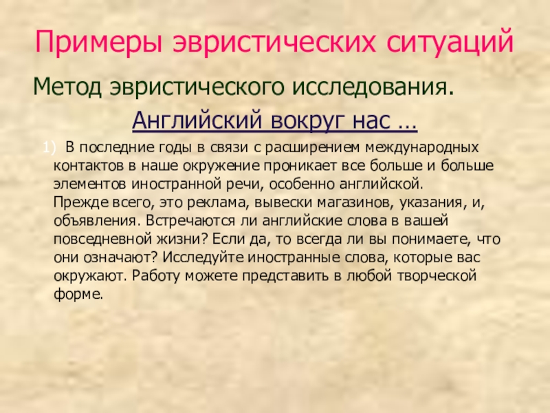 Прежде всего, это реклама, вывески магазинов, указания, и, объявления. Встречаются ли английские слова в вашей повседневной жизни? Если да, то всегда ли вы понимаете, что они означают? Исследуйте иностранные слова, которые вас окружают. Работу можете представить в любой творческой форме.