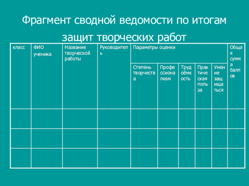 Слайд 22Фрагмент сводной ведомости по итогам защит творческих работ