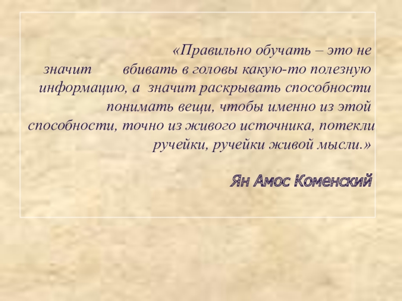 «Правильно обучать – это не значит вбивать в головы какую-то полезную информацию, а значит раскрывать способности понимать вещи, чтобы именно из этой способности, точно из живого источника, потекли ручейки, ручейки живой мысли.»