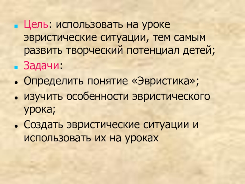 Цель: использовать на уроке эвристические ситуации, тем самым развить творческий потенциал