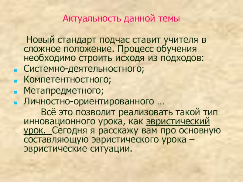 Всё это позволит реализовать такой тип инновационного урока, как эвристический урок. Сегодня я расскажу вам про основную составляющую эвристического урока – эвристические ситуации.