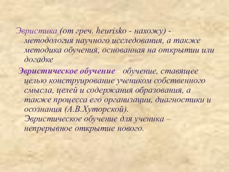 Эвристическое обучение - обучение, ставящее целью конструирование учеником собственного смысла, целей и содержания образования, а также процесса его организации, диагностики и осознания (А.В.Хуторской).