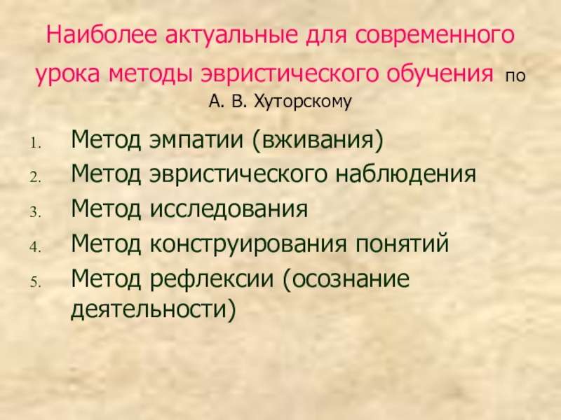 Слайд 15Наиболее актуальные для современного урока методы эвристического обучения по А. В.