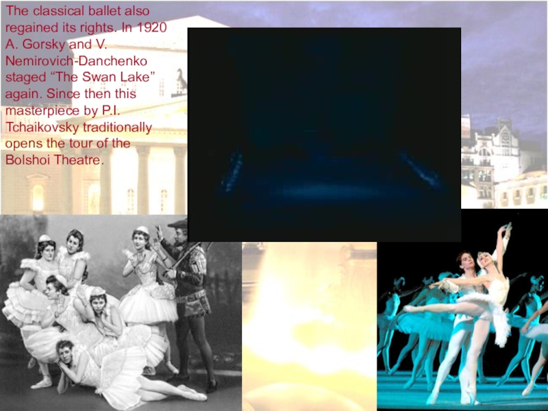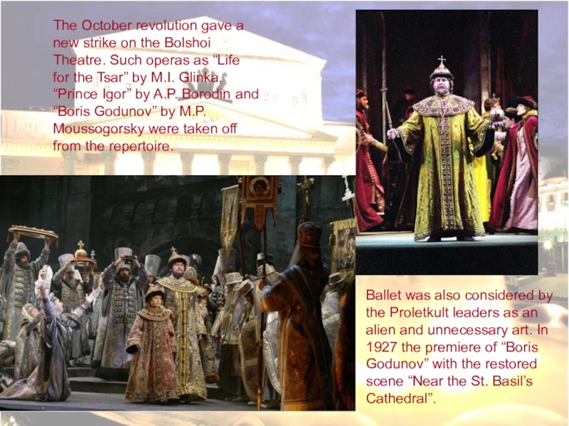 Ballet was also considered by the Proletkult leaders as an alien and unnecessary art. In 1927 the premiere of “Boris Godunov” with the restored scene “Near the St. Basil’s Cathedral”.
