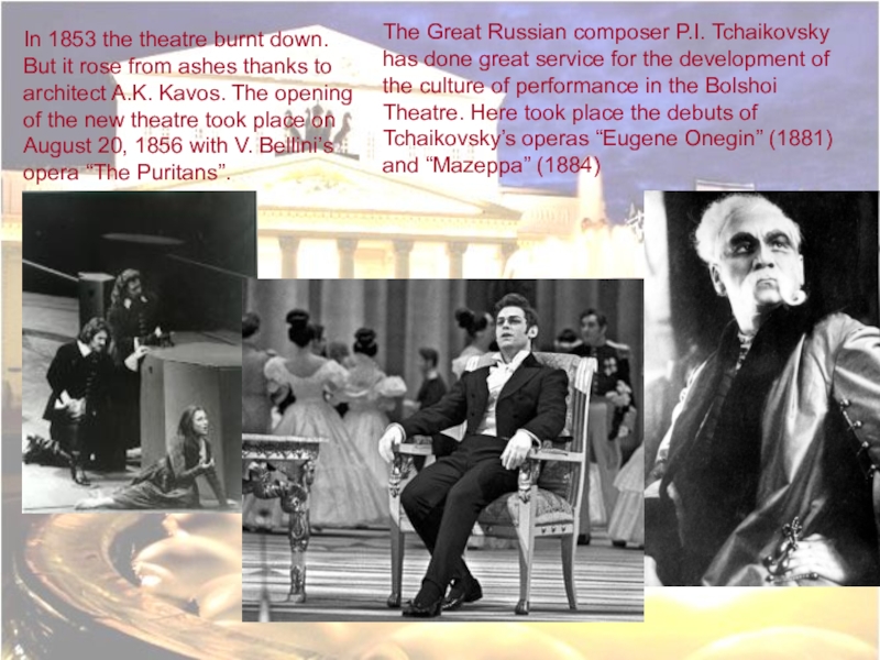 The Great Russian composer P.I. Tchaikovsky has done great service for the development of the culture of performance in the Bolshoi Theatre. Here took place the debuts of Tchaikovsky’s operas “Eugene Onegin” (1881) and “Mazeppa” (1884)