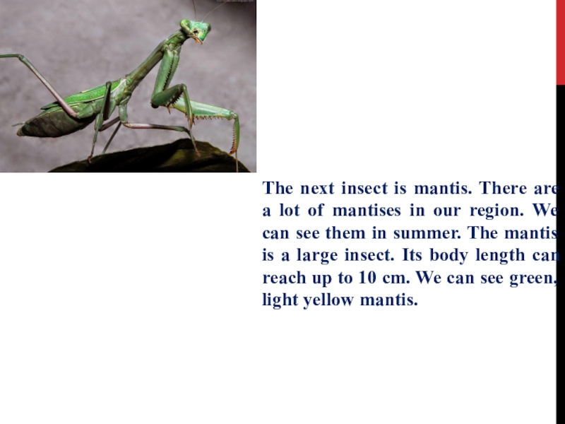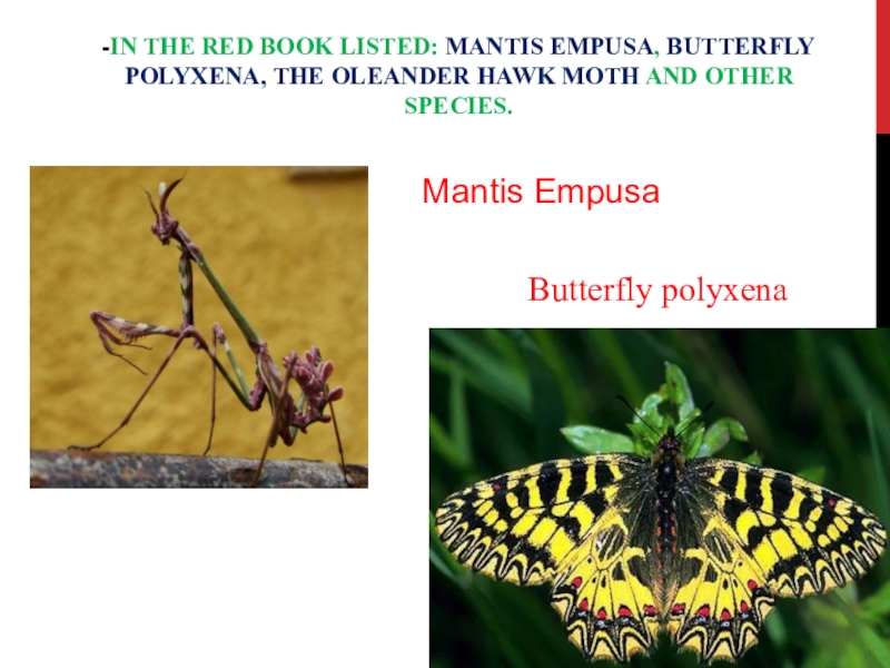 Слайд 4-In the Red book listed: mantis Empusa, butterfly polyxena, the oleander
