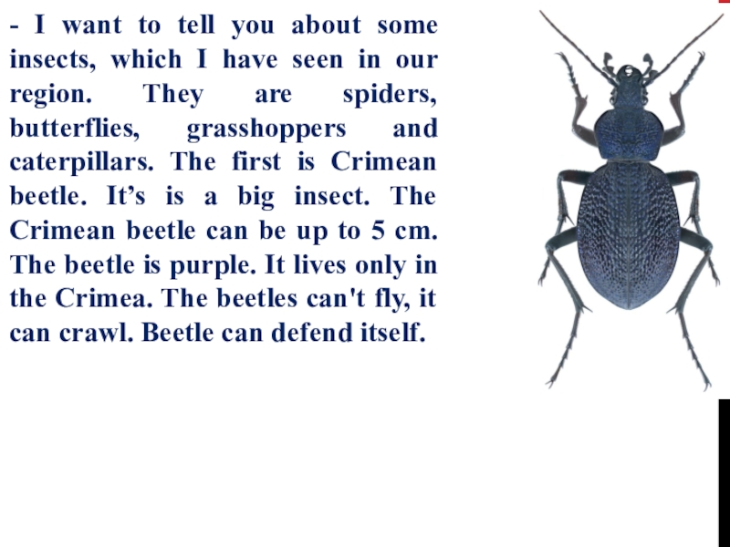 have seen in our region. They are spiders, butterflies, grasshoppers and caterpillars. The first is Crimean beetle. It’s is a big insect. The Crimean beetle can be up to 5 cm. The beetle is purple. It lives only in the Crimea. The beetles can't fly, it can crawl. Beetle can defend itself.