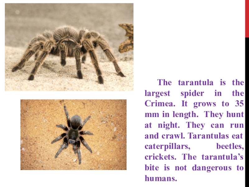 Слайд 7 The tarantula is the largest spider in the Crimea. It grows