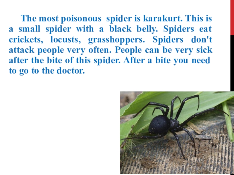 Слайд 8 The most poisonous spider is karakurt. This is a small spider