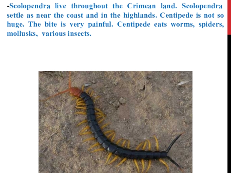 Слайд 12-Scolopendra live throughout the Crimean land. Scolopendra settle as near the