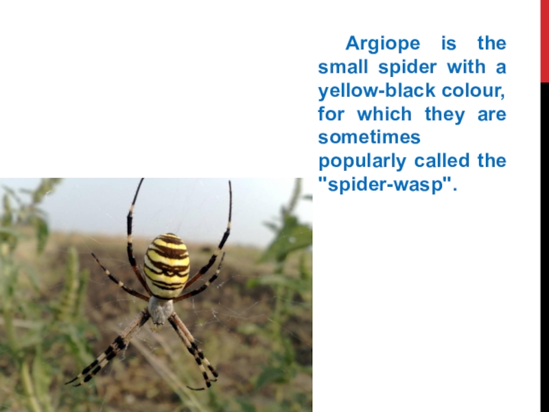 Слайд 10 Argiope is the small spider with a yellow-black colour, for which