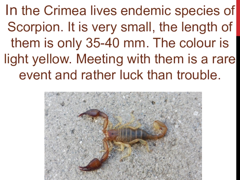 Слайд 11In the Crimea lives endemic species of Scorpion. It is very