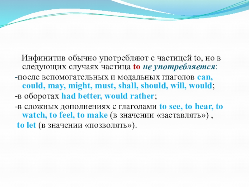 Слайд 14 Инфинитив обычно употребляют с частицей to, но в следующих