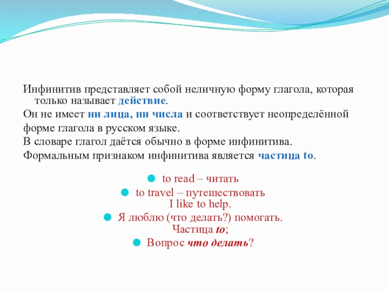 Слайд 9Инфинитив представляет собой неличную форму глагола, которая только называет действие.