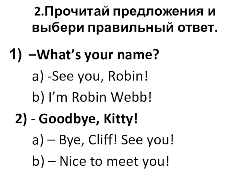 2.Прочитай предложения и выбери правильный ответ.–What’s your name?   a) -See you, Robin!   b)