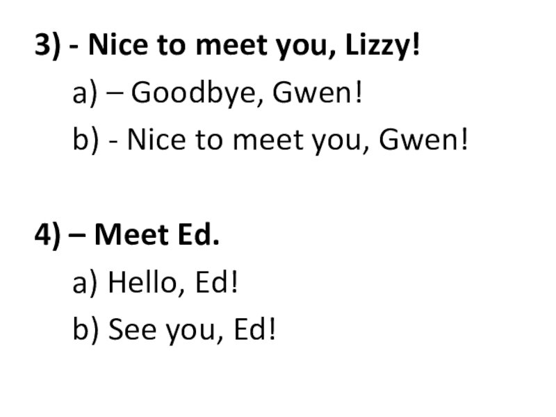 3) - Nice to meet you, Lizzy!   a) – Goodbye, Gwen!   b) -