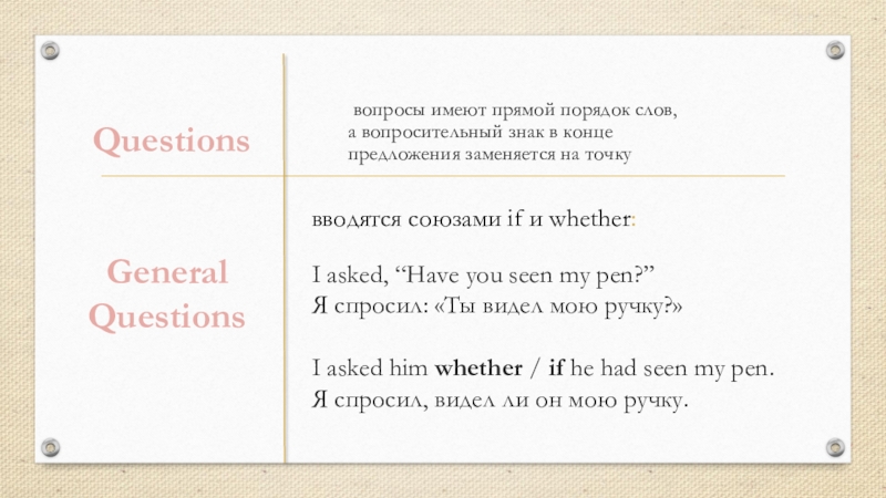 вопросы имеют прямой порядок слов, а вопросительный знак в конце предложения заменяется на точку