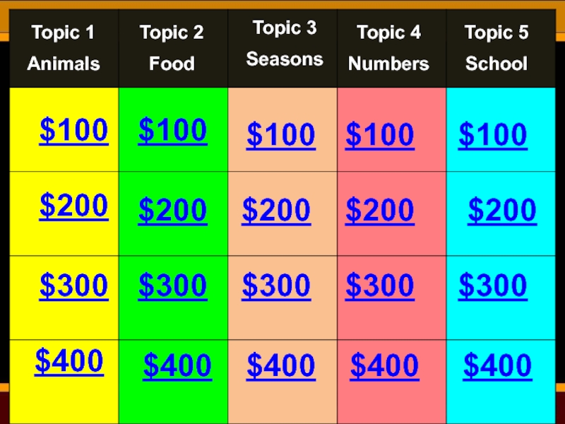 $100$200$300$400$100$200$300$400$400$400$400$300$300$300$200$200$200$100$100$100Topic 1AnimalsTopic 3SeasonsTopic 4NumbersTopic 5SchoolTopic 2Food