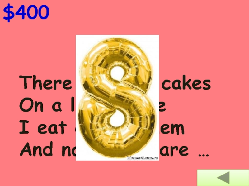 There are nine cakesOn a little plateI eat one of themAnd now there are …$400