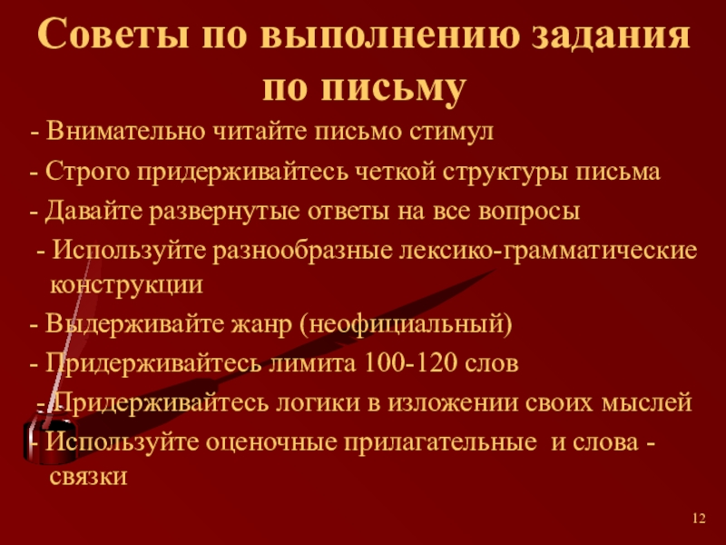 Слайд 12Советы по выполнению задания по письму