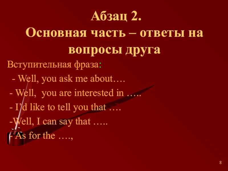 Основная часть – ответы на вопросы друга