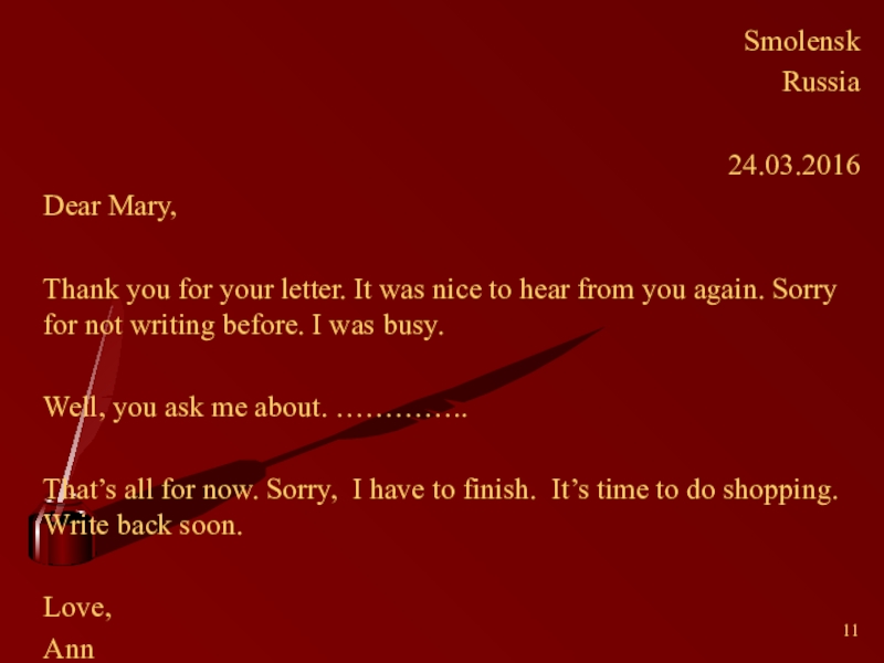 That’s all for now. Sorry, I have to finish. It’s time to do shopping. Write back soon.