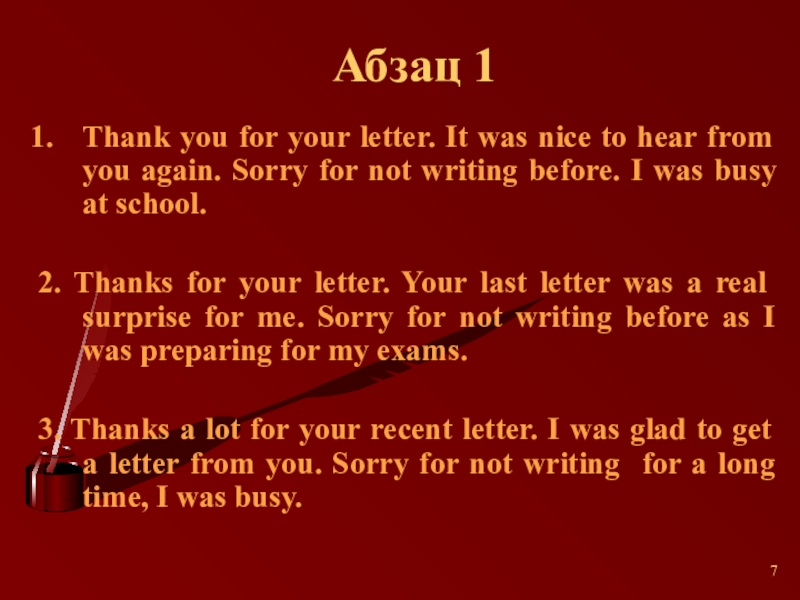 3. Thanks a lot for your recent letter. I was glad to get a letter from you. Sorry for not writing for a long time, I was busy.