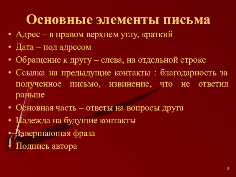 Слайд 3Основные элементы письма