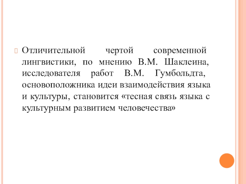 Слайд 3Отличительной чертой современной лингвистики, по мнению В.М. Шаклеина, исследователя работ В.М.