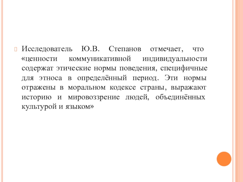 Слайд 12Исследователь Ю.В. Степанов отмечает, что «ценности коммуникативной индивидуальности содержат этические нормы