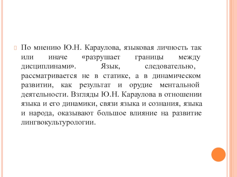 Слайд 15По мнению Ю.Н. Караулова, языковая личность так или иначе «разрушает границы