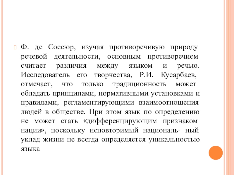различия между языком и речью. Исследователь его творчества, Р.И. Кусарбаев, отмечает, что только традиционность может обладать принципами, нормативными установками и правилами, регламентирующими взаимоотношения людей в обществе. При этом язык по определению не может стать «дифференцирующим признаком нации», поскольку неповторимый националь- ный уклад жизни не всегда определяется уникальностью языка