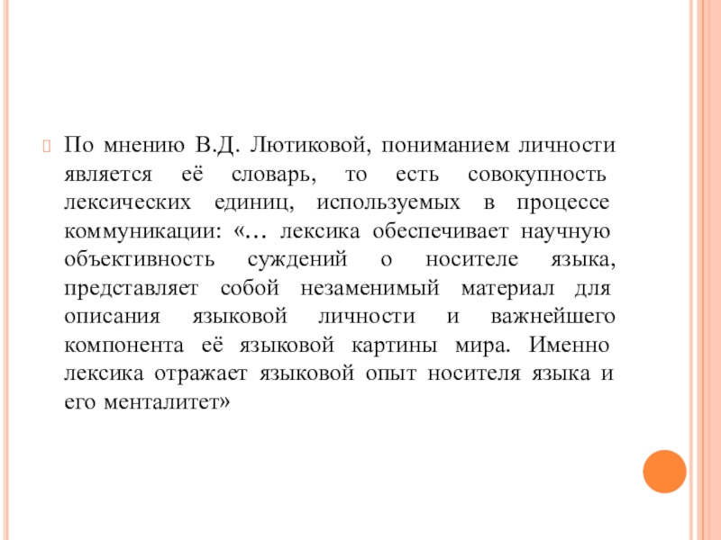 Слайд 17По мнению В.Д. Лютиковой, пониманием личности является её словарь, то есть