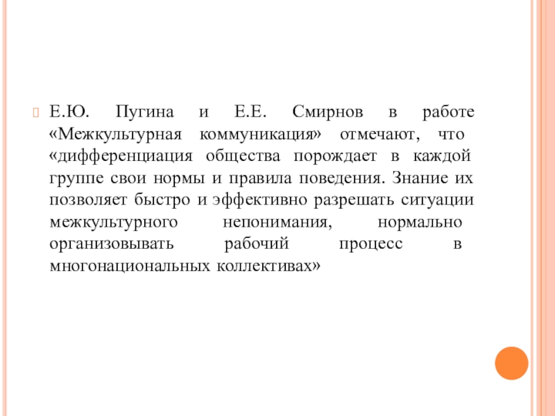 Слайд 14Е.Ю. Пугина и Е.Е. Смирнов в работе «Межкультурная коммуникация» отмечают, что