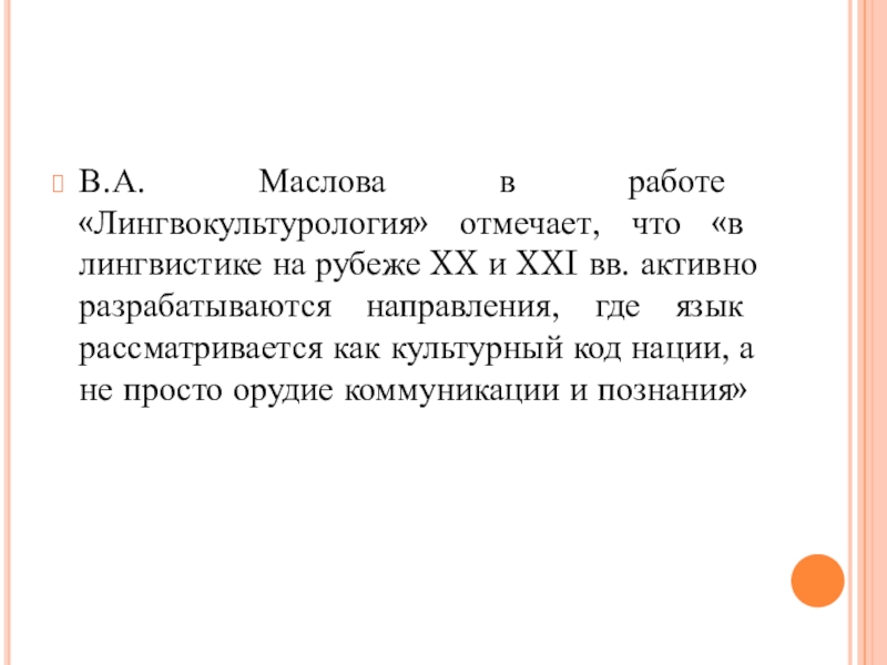 Слайд 2В.А. Маслова в работе «Лингвокультурология» отмечает, что «в лингвистике на рубеже