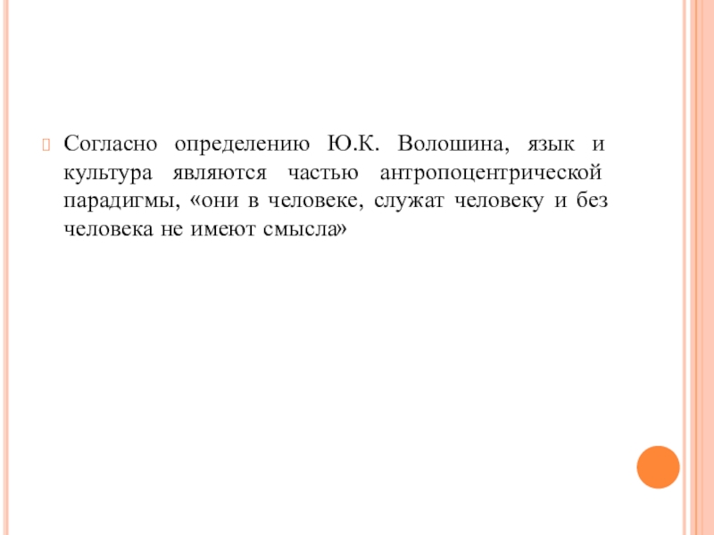 Слайд 11Согласно определению Ю.К. Волошина, язык и культура являются частью антропоцентрической парадигмы,