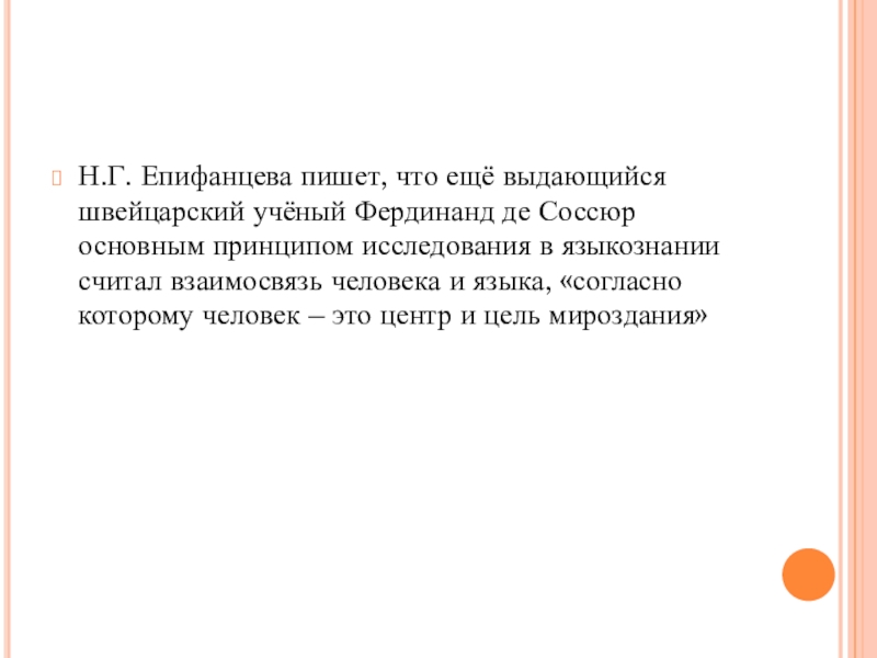 Слайд 6Н.Г. Епифанцева пишет, что ещё выдающийся швейцарский учёный Фердинанд де Соссюр