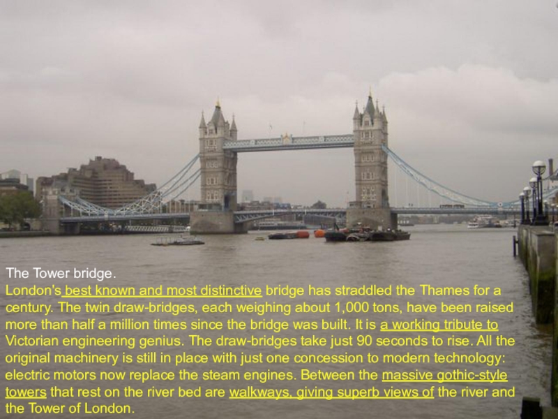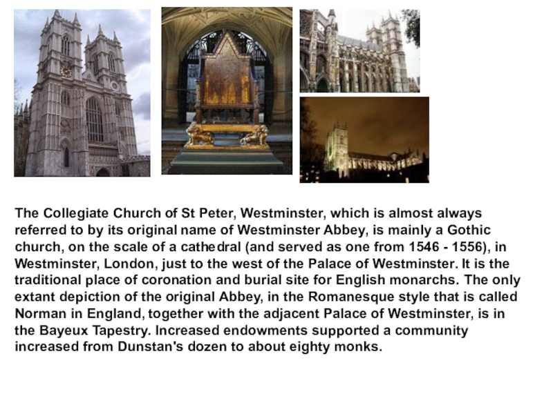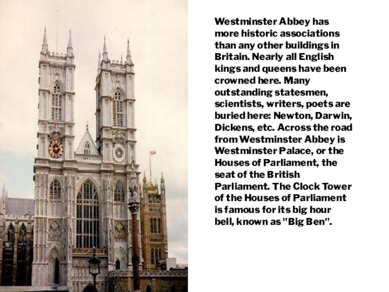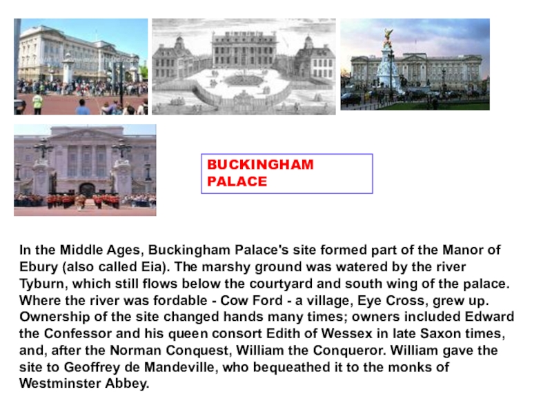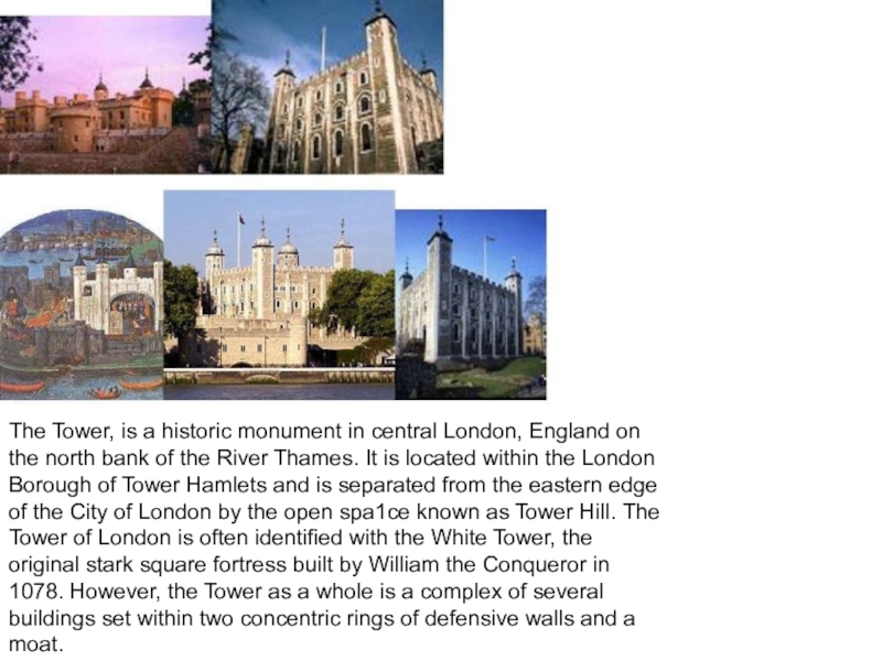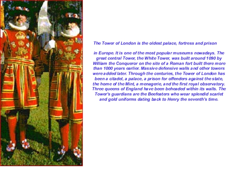 in Europe. It is one of the most popular museums nowadays. The great central Tower, the White Tower, was built around 1090 by William the Conqueror on the site of a Roman fort built there more than 1000 years earlier. Massive defensive walls and other towers were added later. Through the centuries, the Tower of London has been a citadel, a palace, a prison for offenders against the state, the home of the Mint, a menagerie, and the first royal observatory. Three queens of England have been beheaded within its walls. The Tower's guardians are the Beefeaters who wear splendid scarlet and gold uniforms dating back to Henry the seventh's time.