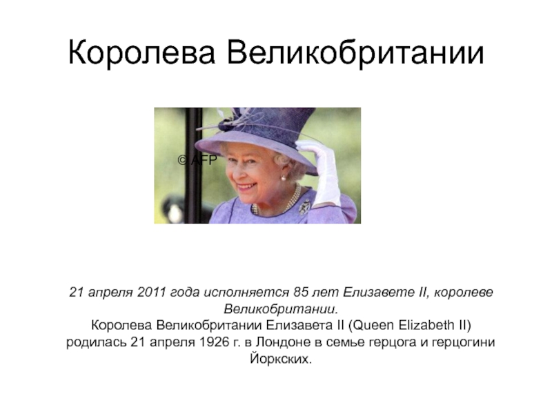 Королева Великобритании© AFP21 апреля 2011 года исполняется 85 лет Елизавете II, королеве Великобритании.Королева Великобритании Елизавета II (Queen Elizabeth II) родилась 21 апреля 1926 г. в Лондоне в семье герцога и герцогини Йоркских.