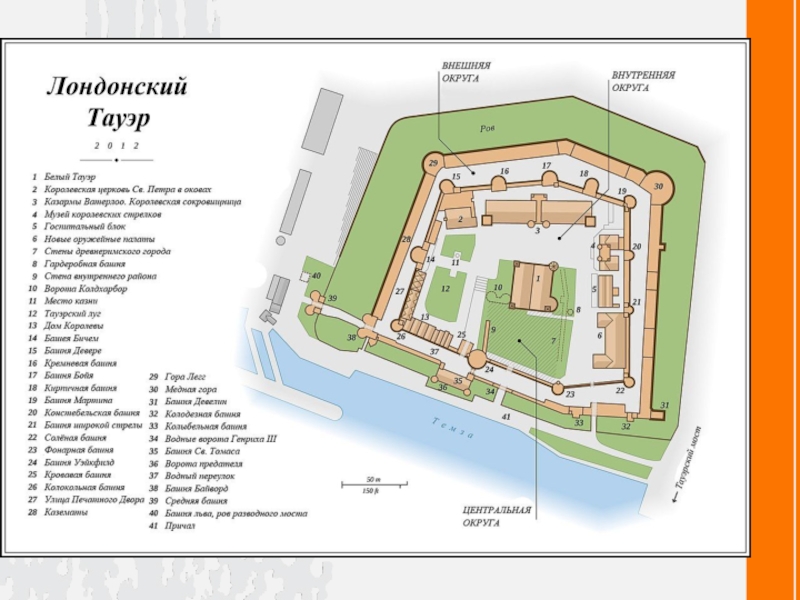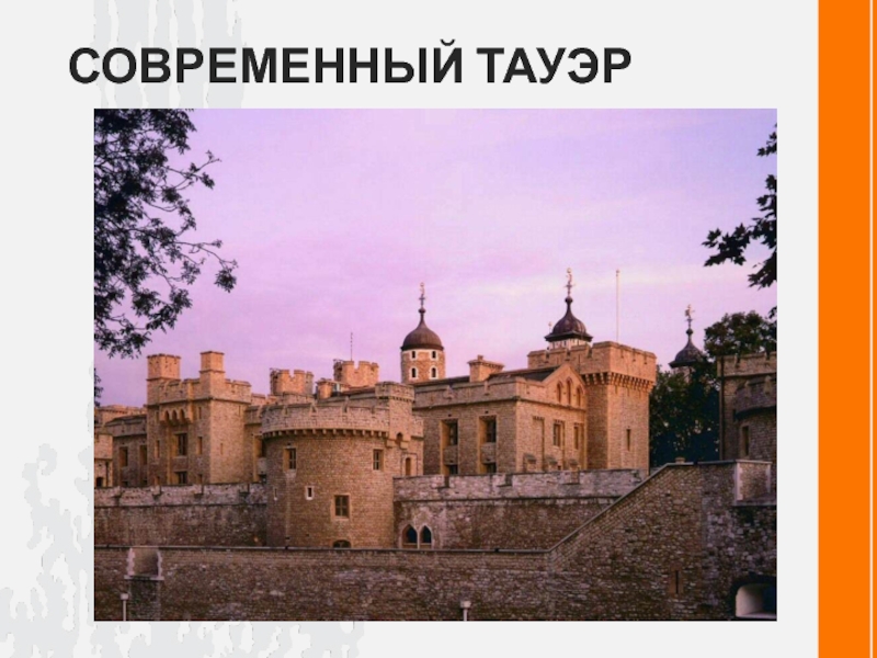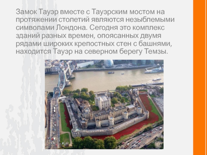 символами Лондона. Сегодня это комплекс зданий разных времен, опоясанных двумя рядами широких крепостных стен с башнями, находится Тауэр на северном берегу Темзы.