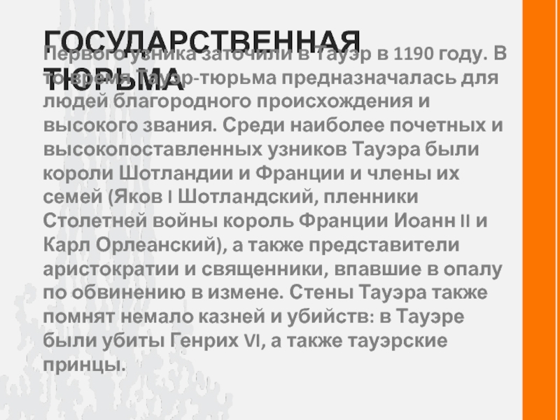 Государственная тюрьмаПервого узника заточили в Тауэр в 1190 году. В то время Тауэр-тюрьма предназначалась для людей благородного