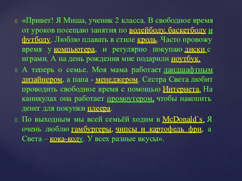 Слайд 13«Привет! Я Миша, ученик 2 класса. В свободное время от уроков