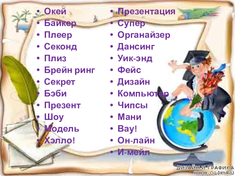 Быт: фас-фуд, бой-френд, супер-гел, бизнес-лейди, лузер, хай, хот-дог, ок, найс, гуд, го, бэйби, вип…