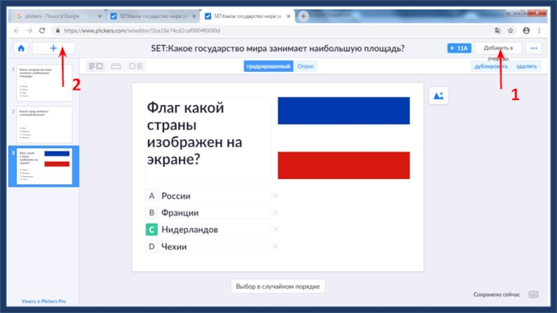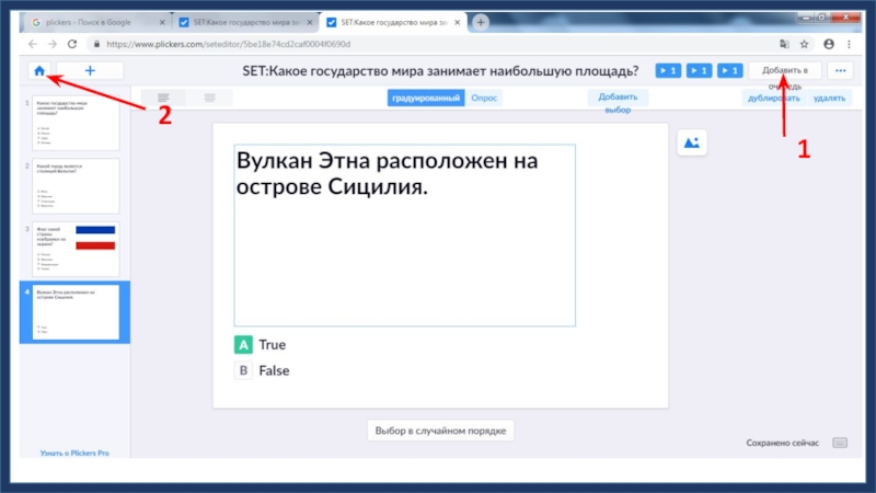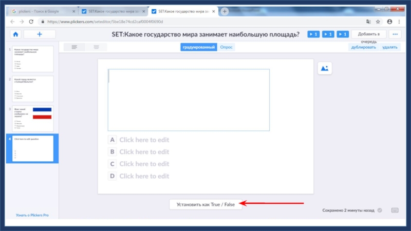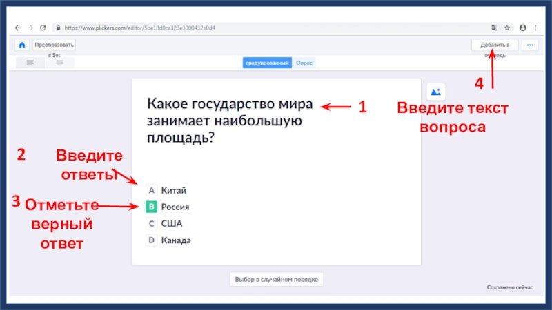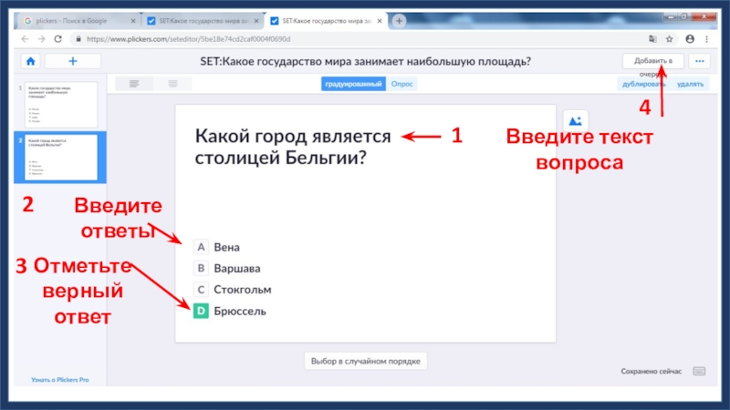 1Введите текст вопроса2Введите ответы3Отметьте верный ответ4