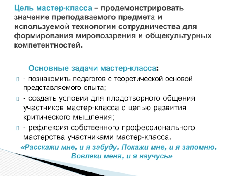 Цель мастер-класса – продемонстрировать значение преподаваемого предмета и используемой технологии сотрудничества для формирования мировоззрения и общекультурных компетентностей.