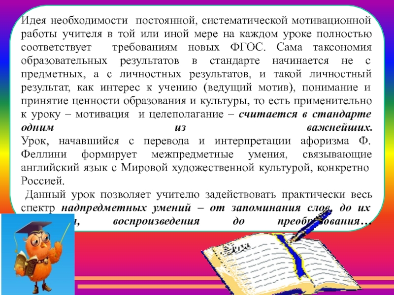 Федеральный государственный образовательный стандарты (ФГОС) законодательно закрепили обязательность для каждого учителя и администратора эту взаимосвязь предметных, метапредметных и личностных результатов образования школьника ставить перед собой как цель и добиваться этой цели в своей повседневной, рутинной работе.