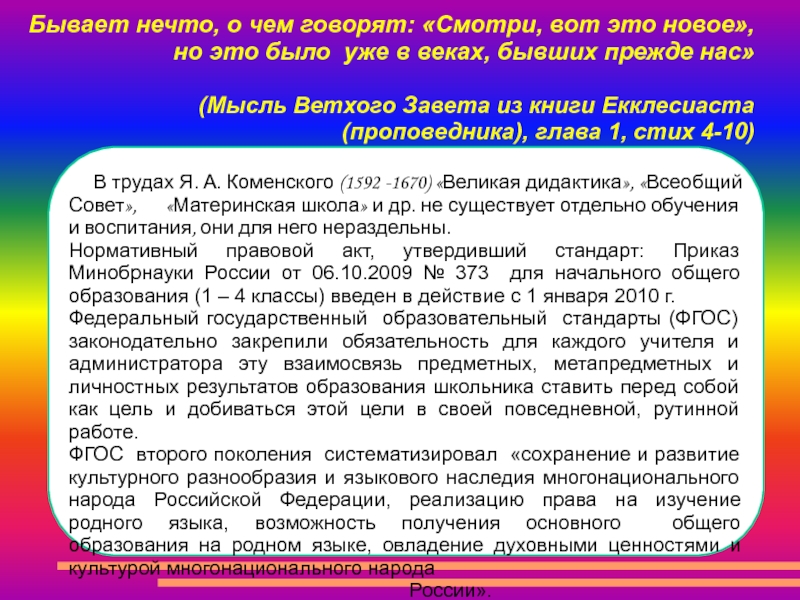 ФГОС второго поколения систематизировал «сохранение и развитие культурного разнообразия и языкового наследия многонационального народа Российской Федерации, реализацию права на изучение родного языка, возможность получения основного общего образования на родном языке, овладение духовными ценностями и культурой многонационального народа