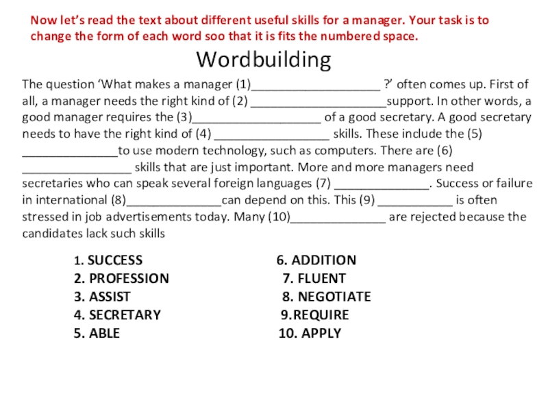 The question ‘What makes a manager (1)___________________ ?’ often comes up. First of all, a manager needs the right kind of (2) ____________________support. In other words, a good manager requires the (3)___________________ of a good secretary. A good secretary needs to have the right kind of (4) _________________ skills. These include the (5) ______________to use modern technology, such as computers. There are (6) ________________ skills that are just important. More and more managers need secretaries who can speak several foreign languages (7) ______________. Success or failure in international (8)______________can depend on this. This (9) ___________ is often stressed in job advertisements today. Many (10)______________ are rejected because the candidates lack such skills