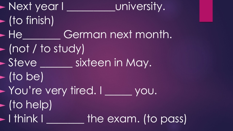 Next year I _________university. (to finish) He_______ German next month. (not / to study) Steve ______ sixteen