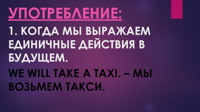 Употребление: 1. Когда мы выражаем единичные действия в будущем.We will take a taxi. – Мы возьмем такси.